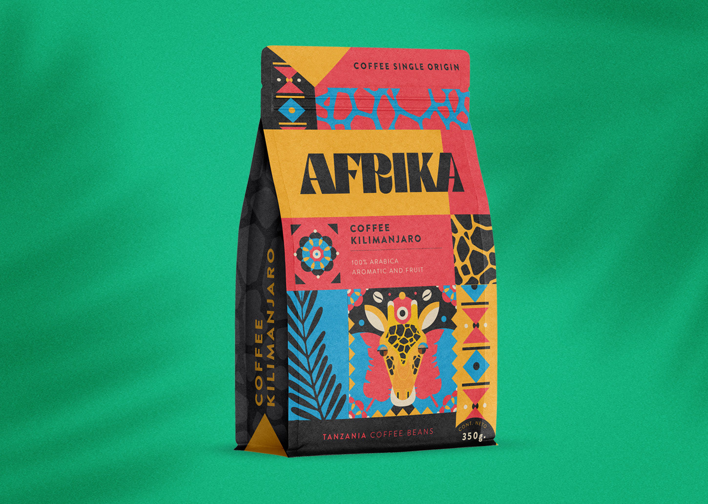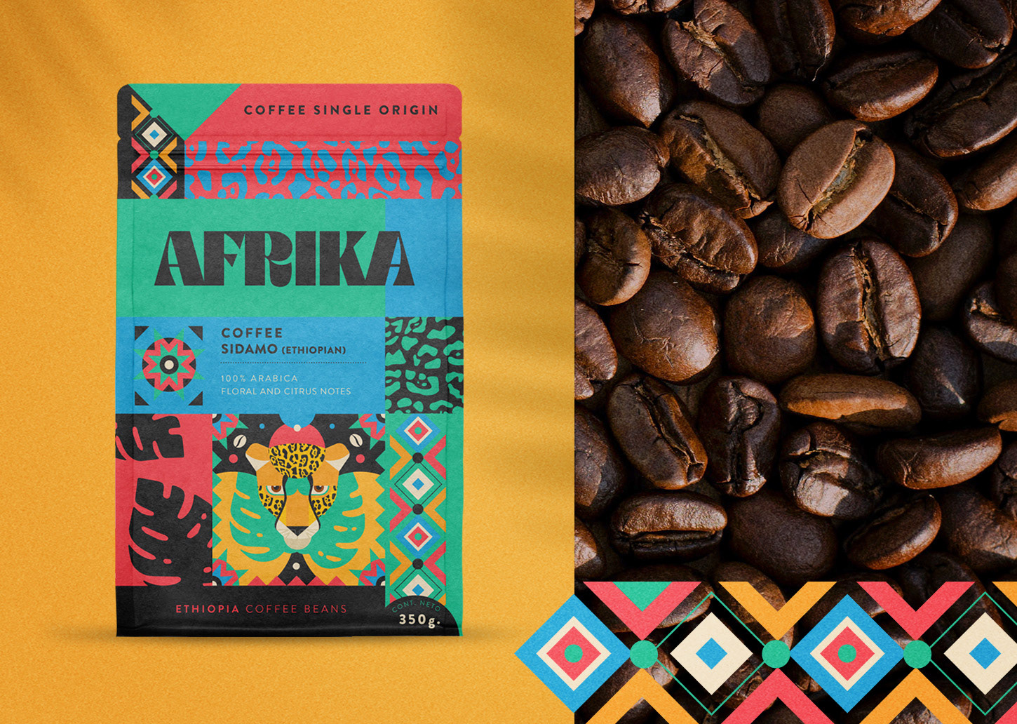 Through an orthogonal grid, geometric elements and the selection of a contrasting color palette were the initial pillars and that is how the idea of this design for these African coffee packs began. This idea of graphic execution allowed us to have thousands of possibilities for creating design pieces, making an almost infinite graphic language and with millions of combinations.